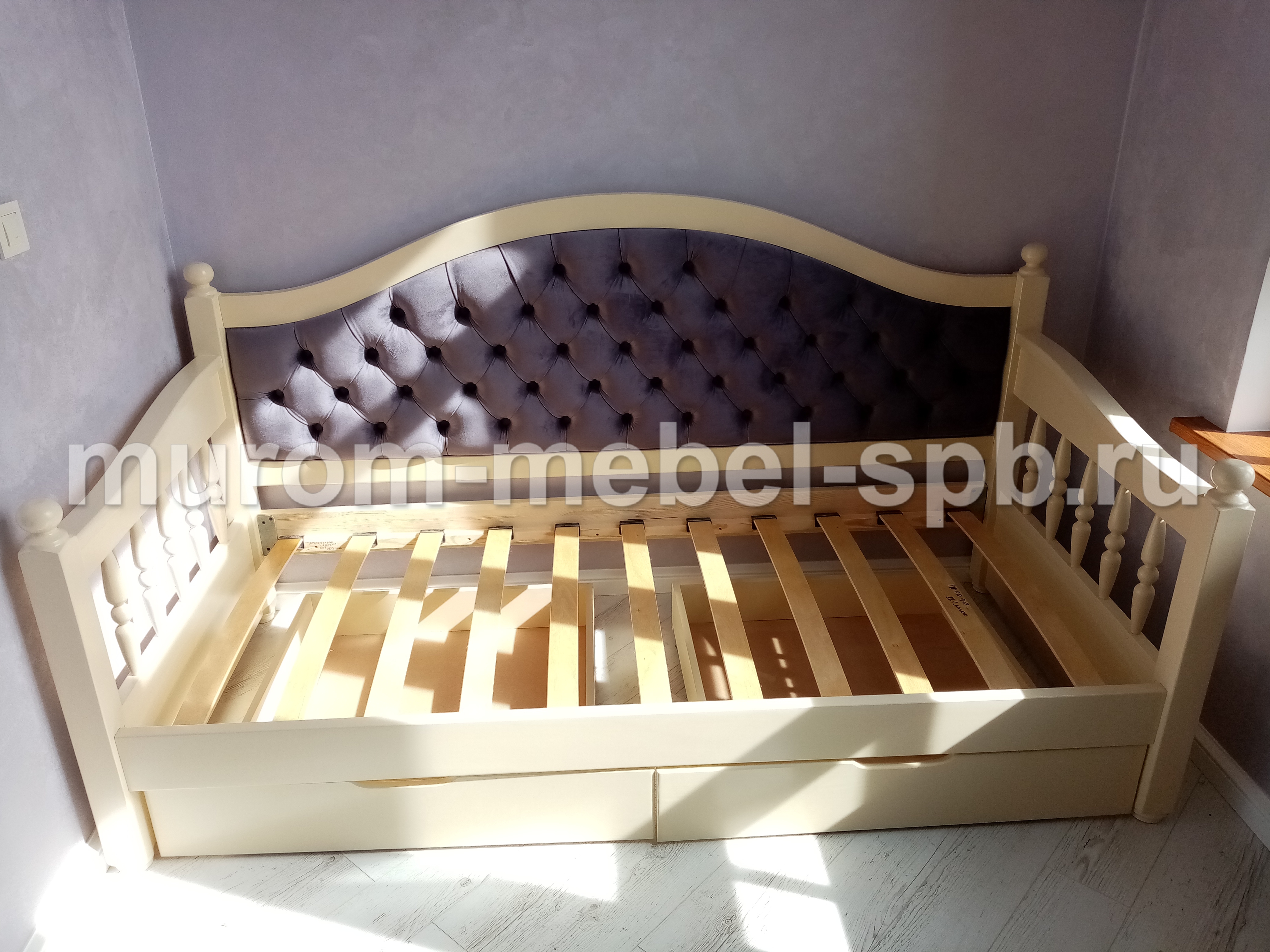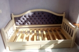 Кровать Ретро – модель с тремя спинками, имеющая привлекательный внешний вид и произведенная из цельного массива дерева. Она подойдет для обустройства спального места одного взрослого или ребенка. Особенностью конструкции здесь является массивный пристенок с каретной стяжкой, боковые спинки обладают резными колоннами. Для расширения функциональности изделие можно дополнить ящиками для хранения белья и подъемным механизмом. Помимо этого, покупателям доступны опции подбора матраса и ткани для мягкой вставки.
